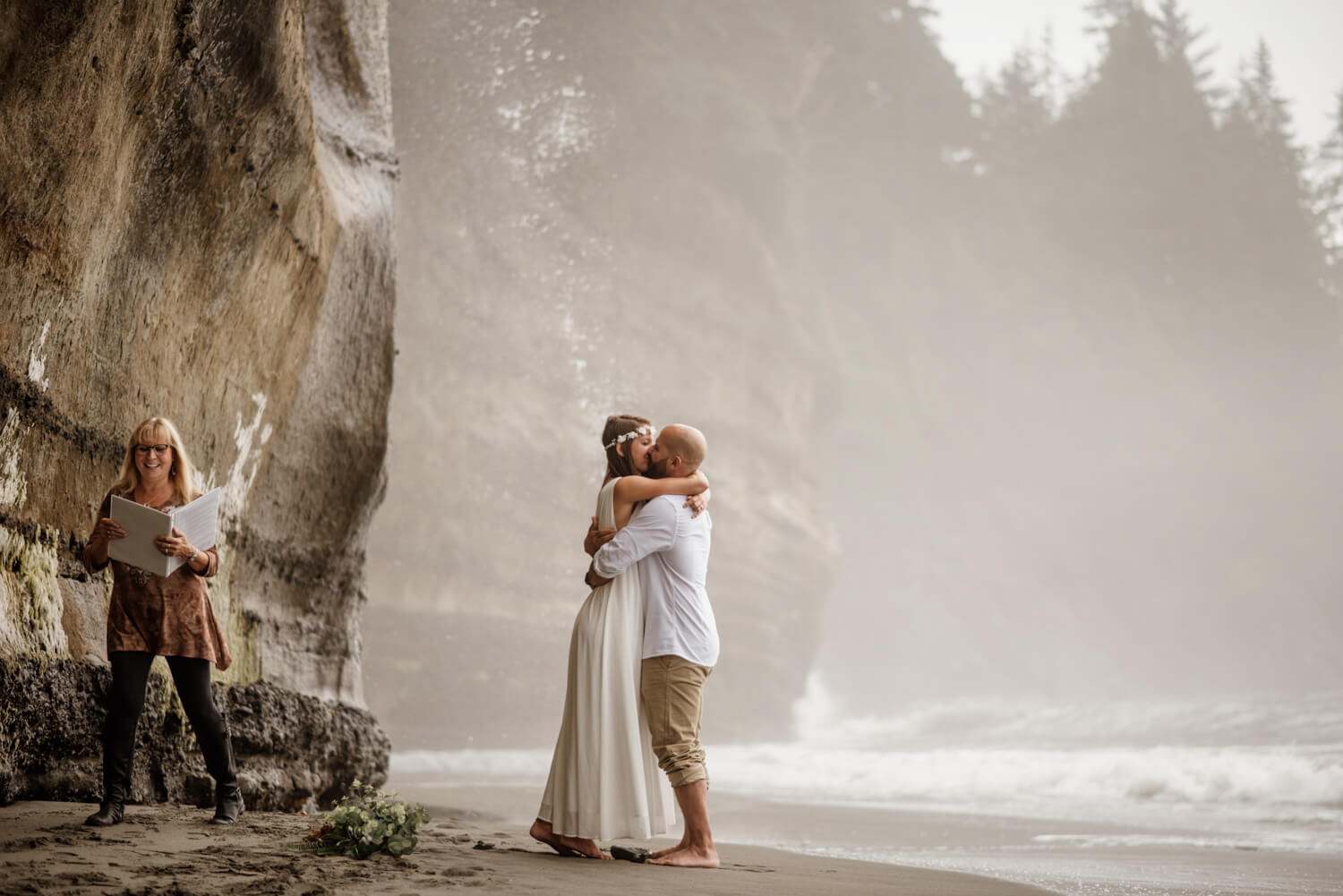 Mystic Beach was the perfect backdrop for a west coast wedding: ancient towering trees, ferns, wild waves crashing. To get to the beach, it’s about a 45 minute hike through the forest. Despite some mud and the long walk, Ashley wore her rubber boots and wedding dress and hiked through the forest like a badass! Of course, we had to stop to coo at every dog we passed (it’s always a dream finding clients who love dogs as much as I do). At the end of the hike, the trees give way to the most incredible view of the Strait of Juan de Fuca and, when the clouds made way, glimpses of the Olympic Mountains.